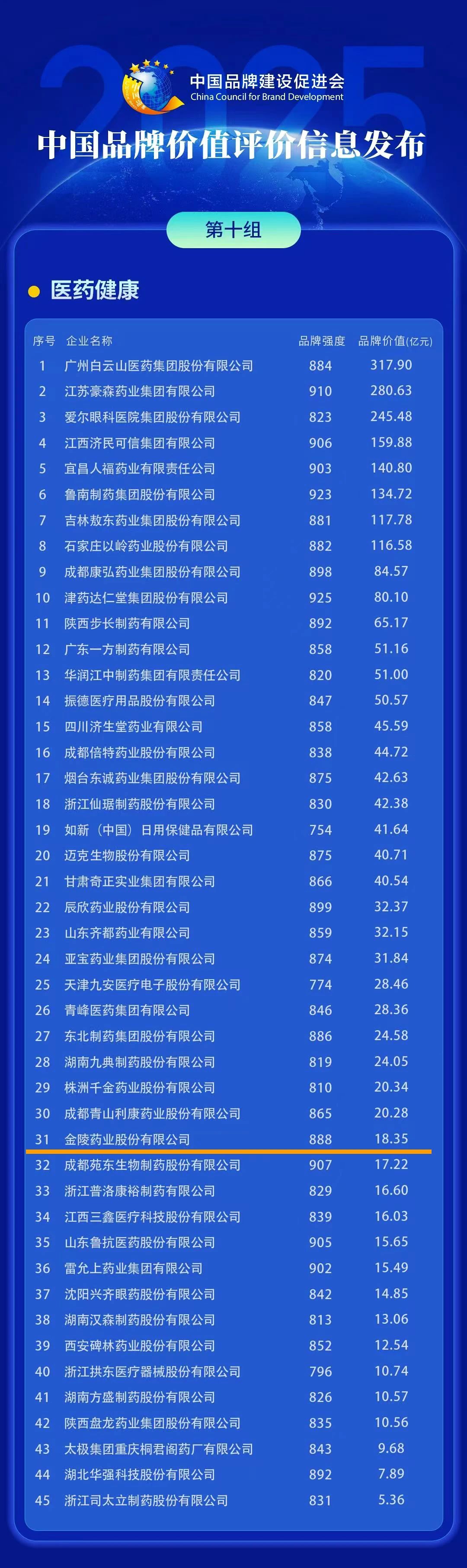 5月10日,由中国品牌建设促进会、中国资产评估协会等权威机构联合发布的《2025中国品牌价值评价信息》揭晓,公司以品牌强度888分,位列医药健康类第13名,较去年跃升11...